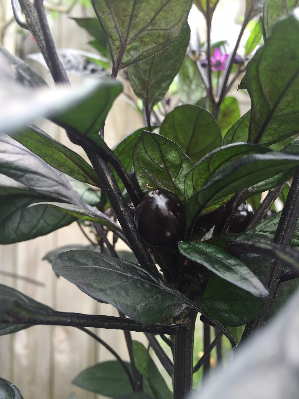 Here are some of the chilies still not quite ready to be tasted! Soon though. Below is the black pearl. So named due to its appearance, but not its gentleness. Only a 30,000 scoville HU. Therefore much like the chili above. I think they are just really pretty!